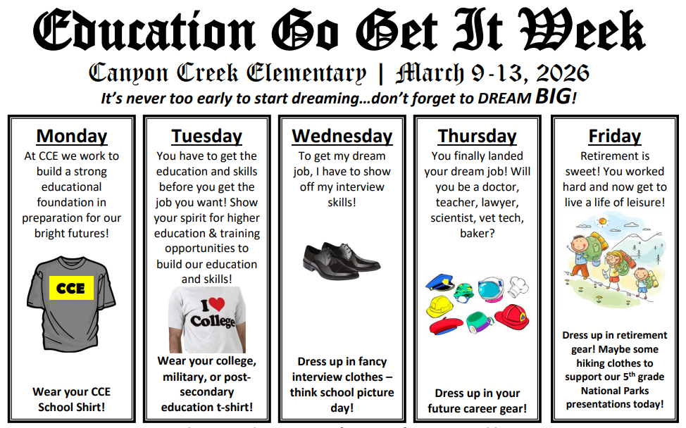 March 9-13, 2026 is Education Go Get It Week (EGGI Week) at Canyon Creek! EGGI Week is a week to focus on exploring and learning about the wide variety of post-secondary opportunities and career choices available in the future for our students. While of course our students don't need to have their future plans set in stone at this early age, it's never too early to start learning about the many, many options that are out there! Canyon Creek plans to celebrate EGGI Week with the following activities: