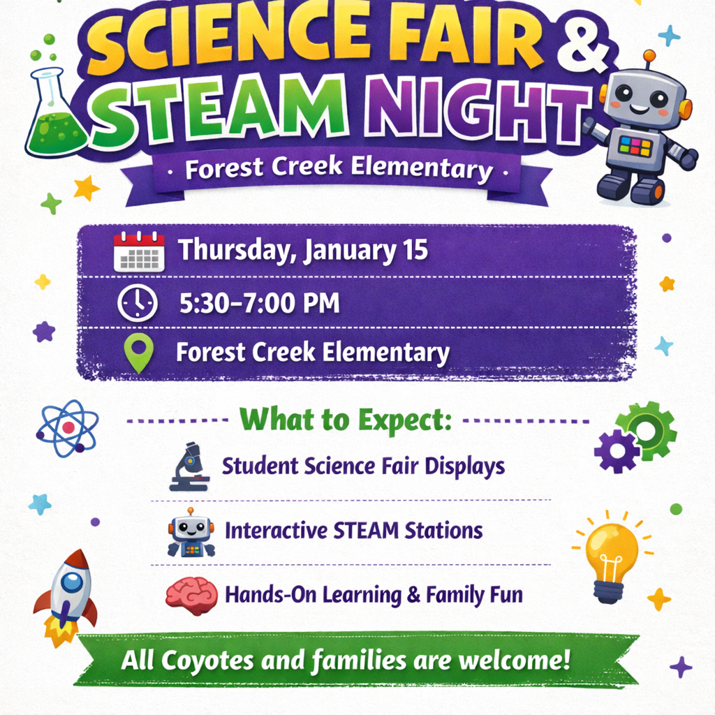 Science Fair Registration will close on Friday, January 9th, @ 11:59 p.m. Please have children register their projects if they want to participate in the fair. The Forest Creek Science Fair is open to all students in grades K-5. Click here to read more! |