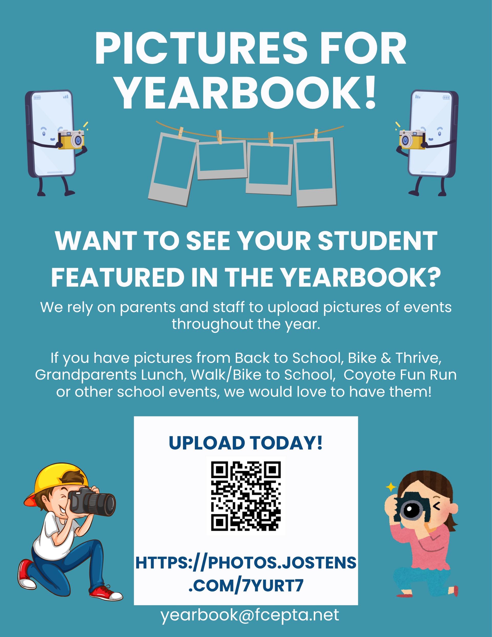 Help us make the yearbook special! Parents and staff are invited to upload photos from school events like Back to School, Bike & Thrive, Grandparents Lunch, Walk/Bike to School, the Coyote Fun Run, and more. Share your pictures at https://photos.jostens.com/7yurt7 or email them to yearbook@fcepta.net.
