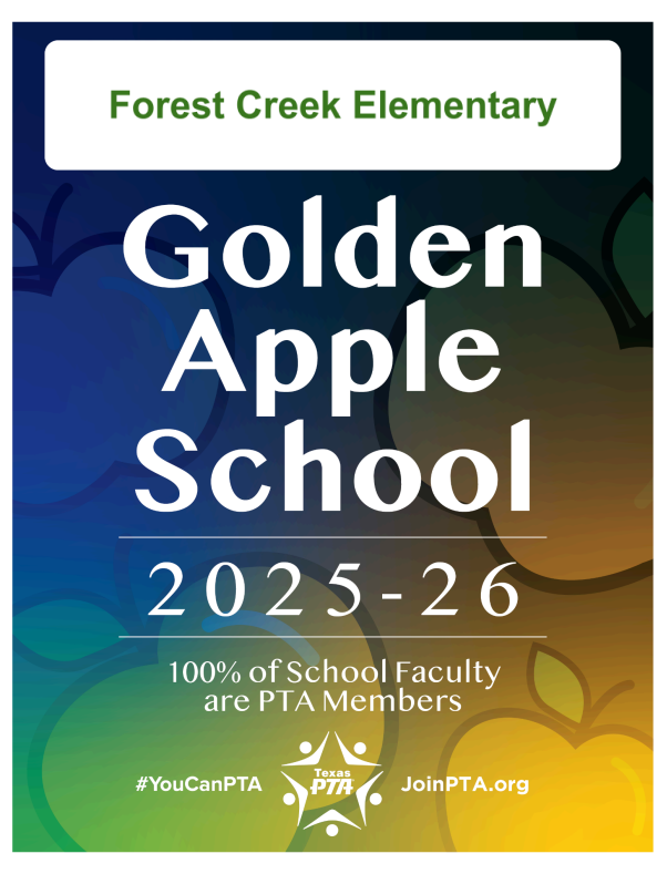Forest Creek Elementary has been named a Golden Apple School for the 2025–26 school year! This honor recognizes that 100% of our faculty are PTA members, reflecting our strong commitment to partnership, support, and student success. Thank you to our incredible staff for making this achievement possible! 🍎✨ |
