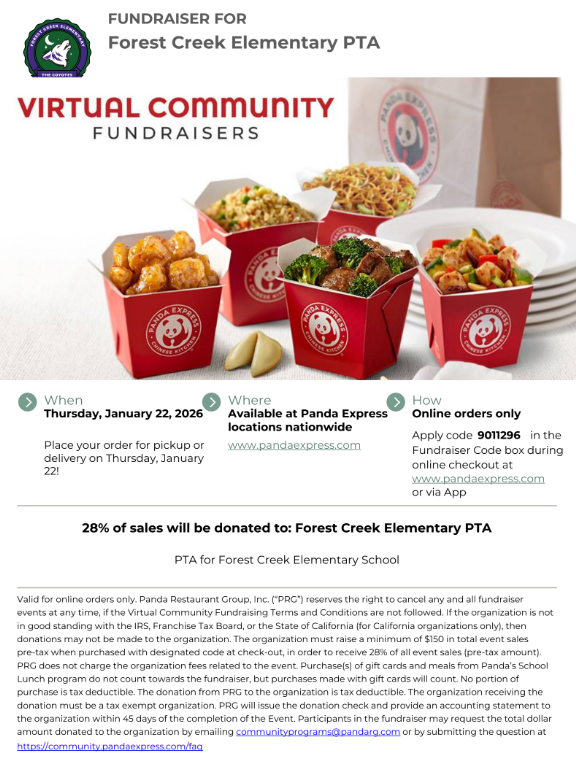 Support Forest Creek Elementary PTA with an easy (and tasty!) fundraiser! On Thursday, January 22, 2026, order Panda Express online for pickup or delivery and 28% of your purchase will be donated to our PTA. Orders can be placed at pandaexpress.com or through the Panda Express app. Be sure to enter Fundraiser Code 9011296 at checkout. Thank you for supporting our school and students! |
