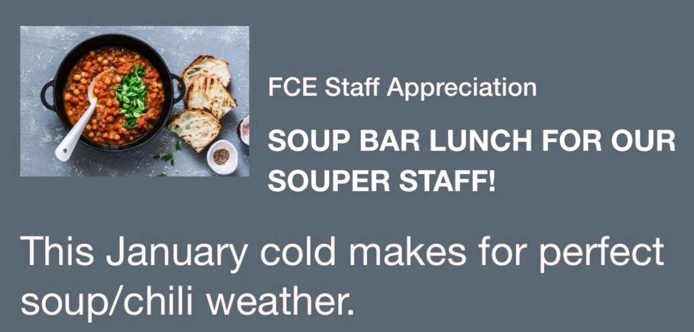 January’s cold weather makes it the perfect time for a warm meal! For January Staff Appreciation, we’re hosting a Soup Bar on Friday, January 30th, and we’d love your help. Donations of soups, stews, chili, and toppings can be dropped off by 10:00 AM in the teachers’ lounge. Please bring soups in a crockpot or warming device and label both the dish and the crockpot. Thank you for helping us show our staff some love—we truly appreciate your support!