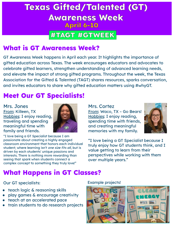This week, we are proud to celebrate Gifted and Talented Awareness Week! It’s a dedicated time to recognize the unique potential, vibrant curiosity, and diverse talents of our gifted learners and the Specialists that teach them!