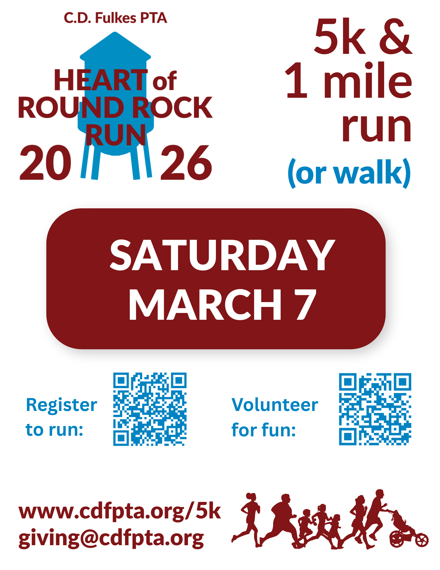 Our school is participating in the Heart of Round Rock Run on Saturday, March 7th at Old Settlers Park. There is a 5k and 1 mile option to run or walk. Registration opens January 30th. Families can sign up to run, walk, or help out, and it is a fun way to spend time together! |