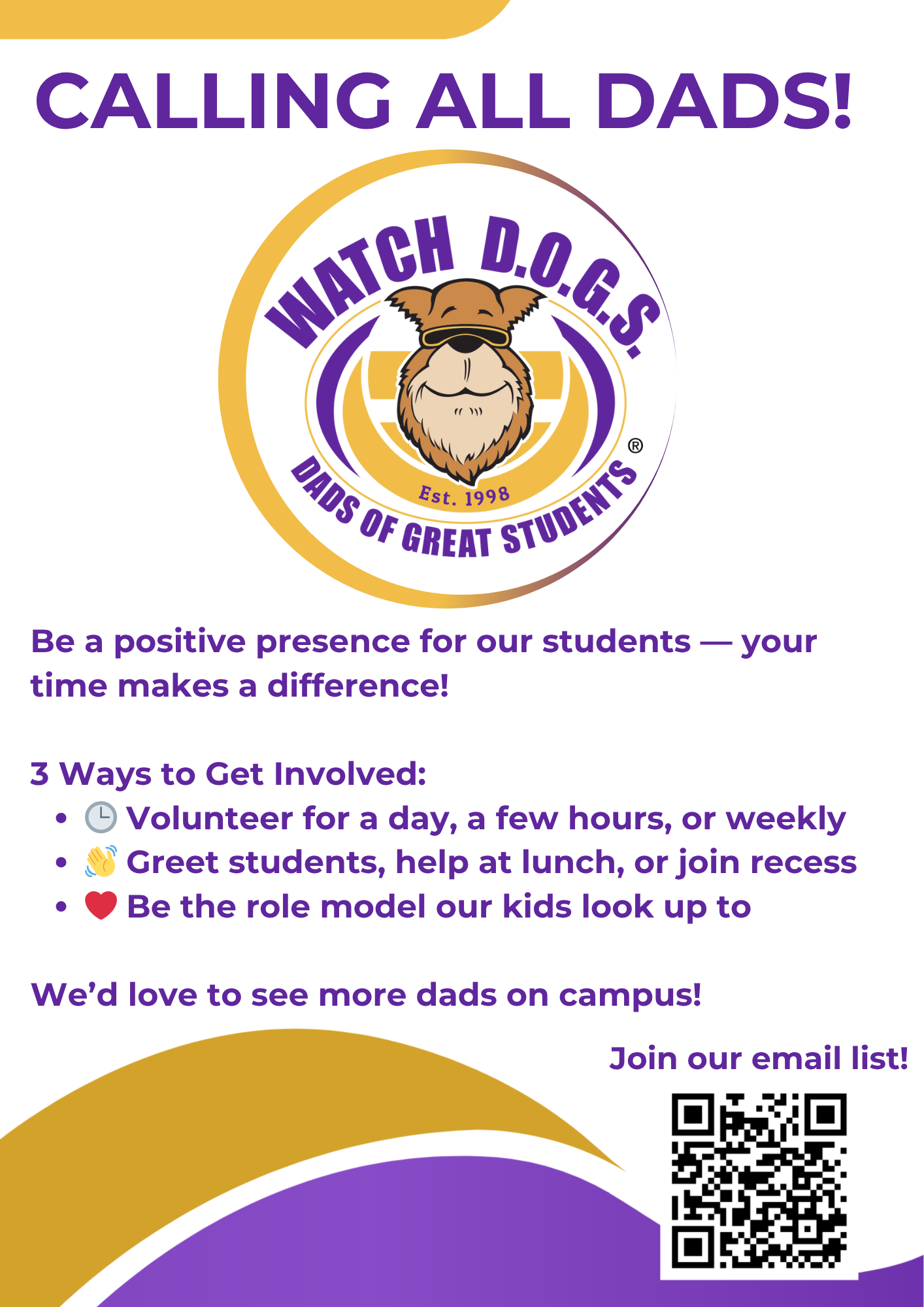 Calling all dads & father figures! Join our Watch D.O.G.S. (Dads of Great Students) program to make a difference at Forest Creek. Spend a day (or even just a few hours) helping around campus and being a positive role model for our students. Scan the QR code in this newsletter to get started! |