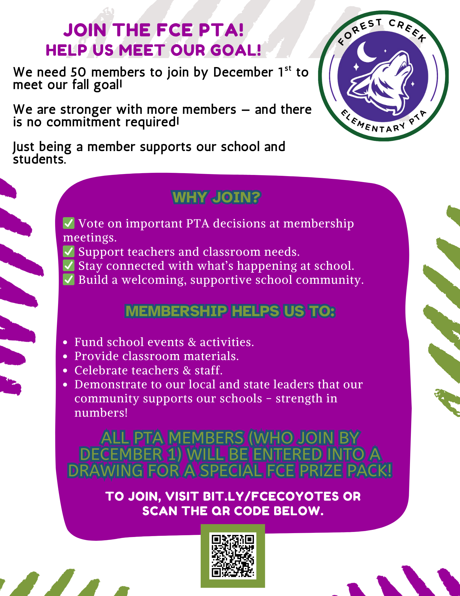 We’re kicking off our November Membership Drive, and we truly need your support! If you haven’t joined the PTA yet, please consider becoming a member by December 1st. Our goal is to welcome 50 new members, and your membership can make a real difference.
