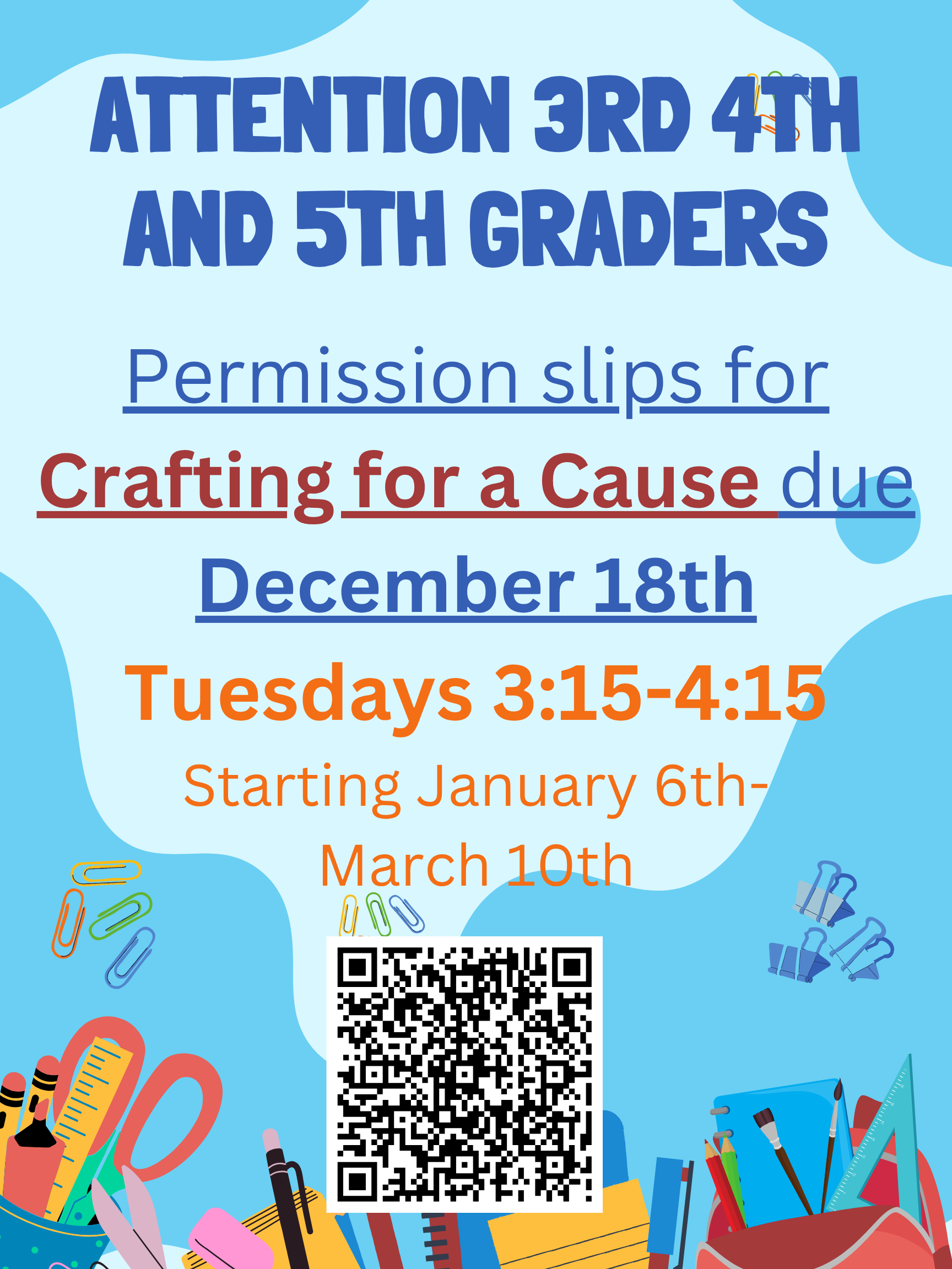 3rd–5th grade students who are interested in joining Crafting for a Cause can sign up using this link or the QR code in the image. Applications are due