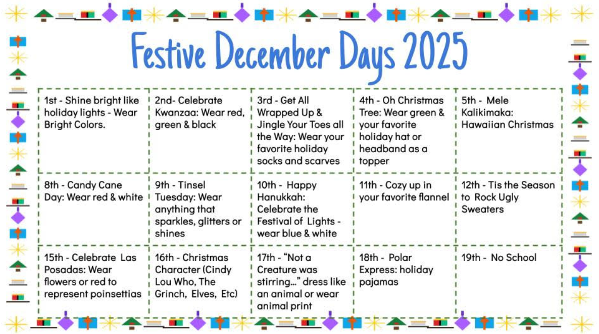 12/9: 2nd grade performance 6:00-7:00. Students arrive at 5:30
