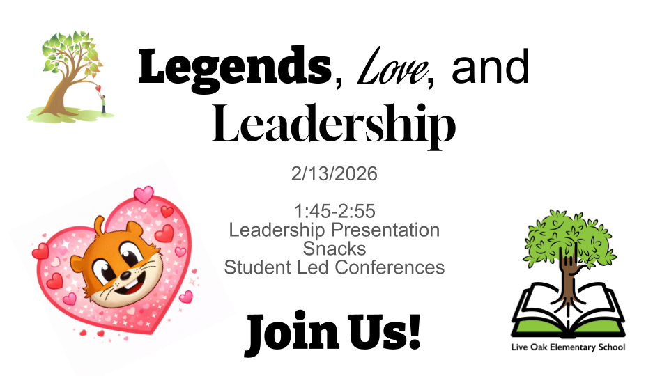 As you know, we are a Leader in Me school, and on Friday, February 13th we will be celebrating our students' leadership with our first ever Legends, Love, and Leadership Day. This will take place from 1:45-2:55 during our Valentine's parties. The party will begin with a short leadership presentation by the students in their classroom. Students will be able to pass out Valentine's (to save time we ask that they are only labeled with your student's name, not classmates) then, parents and students can enjoy refreshments as students share their leadership portfolios with them. Our students' leadership portfolios include sections all about the student, the students' goals, and their celebrations. We encourage all parents to attend so your child can share with you. We will have staff available for students whose parents are unable to attend. We hope you can attend! Thank you for supporting student leadership at Live Oak!