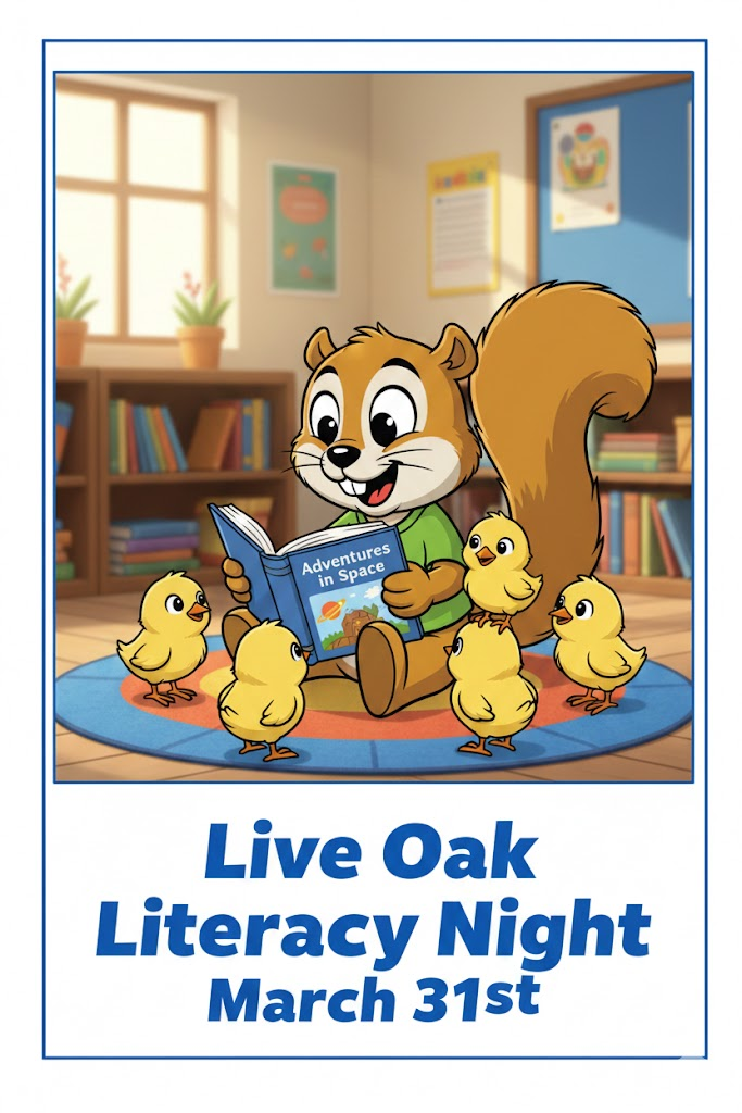 Literacy Night: March 31st. Come enjoy the bookfair, the first grade concert, win books, read to baby chicks, play literacy games and more! |