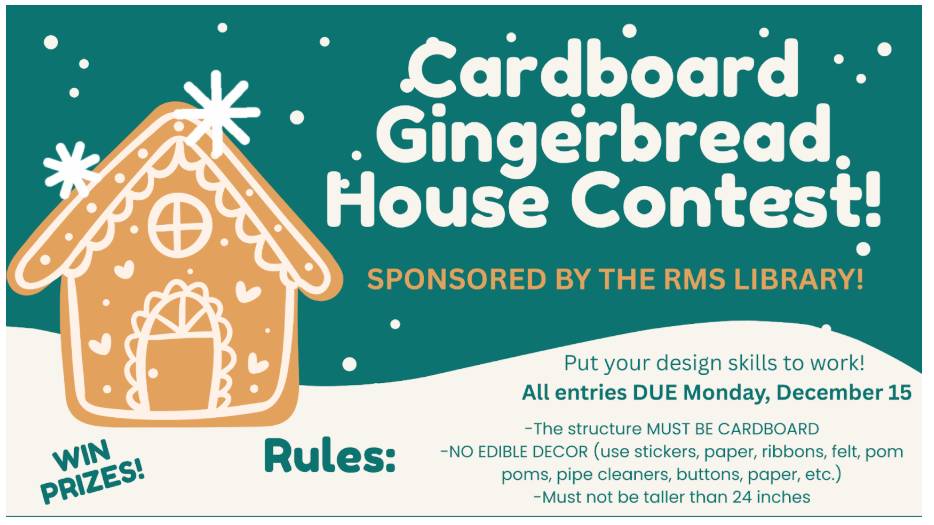 The RMS Library will be hosting a special holiday event this year -- A Cardboard Gingerbread House Decorating Contest! All entries are due Monday, December 15th! Students can check their student email for more details and contest rules. A grand prize winner from each grade level will be selected and will receive a special prize! |