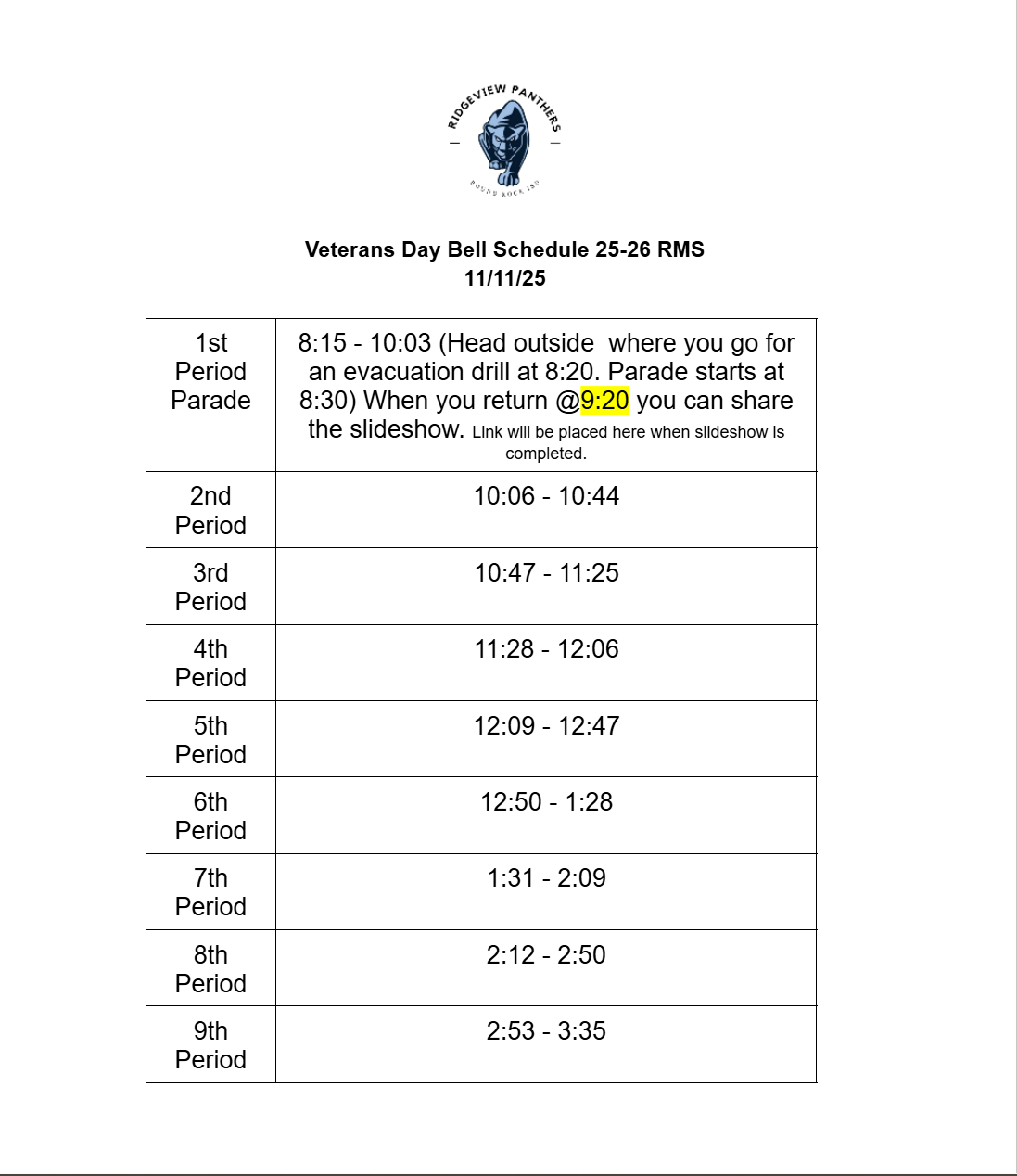 Veterans Day Bell Schedule |