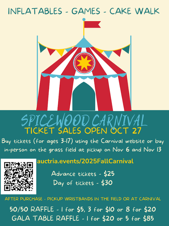 Next Friday is our annual Fall Carnival! Please make sure to read the information further down the flyer and purchase your wristbands! This is a great event that brings our Spicewood community together. We hope to see you there!